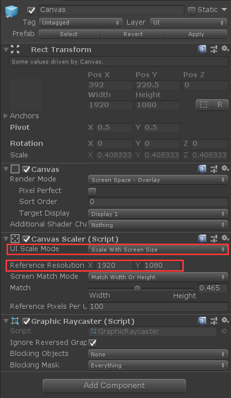 这个Reference Resolution的意思是在这个分辨率下,UI元素显示的比例/尺寸是你想要的效果,或者你就是按照这个分辨率/比例调节的界面元素尺寸,Unity根据这个标准的分辨率来推算不同分辨率下UI元素的缩放程度,而程度是由Match属性决定的,值越小,调节的幅度越大。